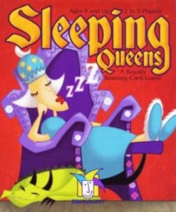 This is a light family card game where the goal is to collect queens worth points (or reach a certain number of queens) before everyone else. You’ll do that by playing sets of number cards to draw new cards, and playing special action cards to wake queens, steal queens, or defend your own.
